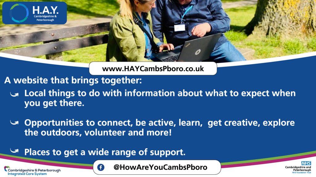 How Are You Cambridgeshire & Peterborough is a family of websites and social media that bring together local activities and services that boost wellbeing. Find things to do and a wide range of support alongside helpful information about what to expect when you get there. Take a look: www.HAYCambsPboro.co.uk
